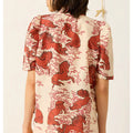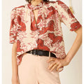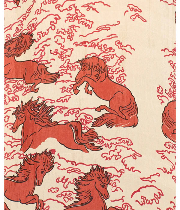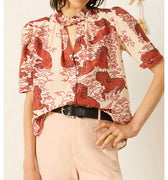 An elevated classic with a bold twist. Featuring a striking horse motif in warm red tones, this airy blouse is finished with a soft stand collar and delicate button front. Effortless, artful, and endlessly chic—perfect tucked in or worn loose for understated drama.
