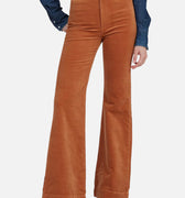 High Rise slim fit wide leg jean with double button waistband. Light weight in a stretch wide wale corduroy.