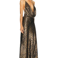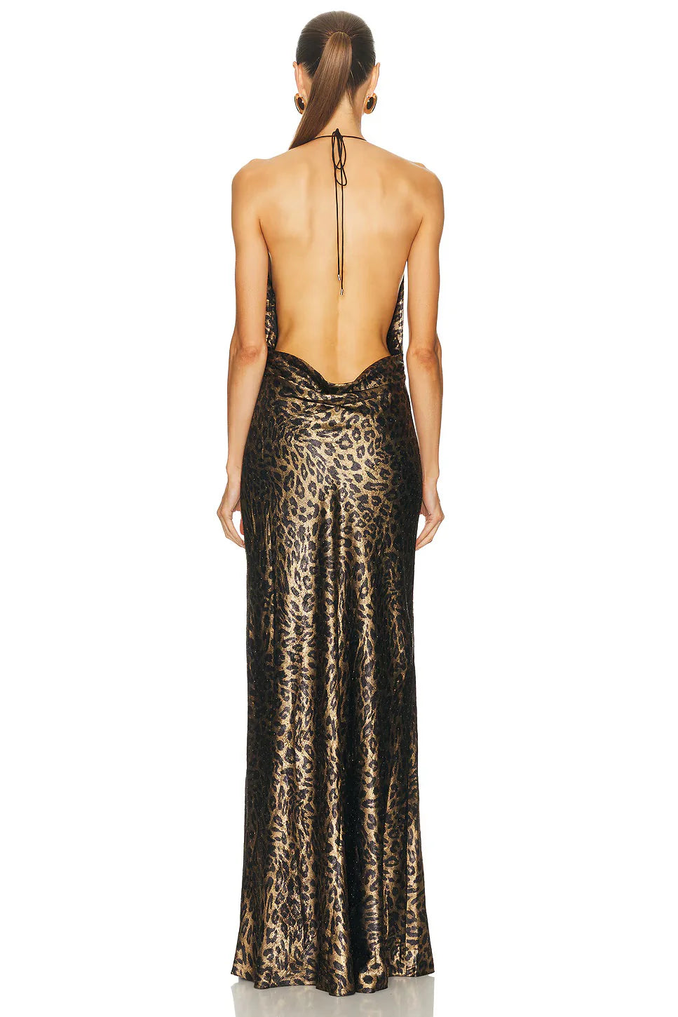 Elevate your night-out look in the Safi Leopard Dress featuring a low cowl neckline, open back and mini crystal embellishments for subtle sparkle. Its fluid drape and refined details create a striking silhouette that moves effortlessly with you.
