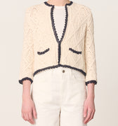 An elegant cropped knit jacket in ecru with marine trim. Featuring delicate openwork, a collarless silhouette, and bracelet sleeves for effortless polish.