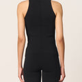 Sleek sleeveless knit top in noir with a sculpted, fitted silhouette and clean high neckline. Minimal, modern, and endlessly versatile.
