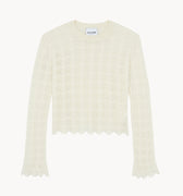 A lightweight Kujten cashmere knit in an elegant ivory tone, this piece features a delicate openwork pattern throughout, giving it an airy, almost lace-like feel. The scalloped hem and cuffs add a subtle romantic touch, while the classic crew neckline keeps it timeless and easy to style. Slightly cropped with a refined silhouette, it’s perfect layered over a camisole or worn on its own as the season shifts.