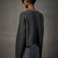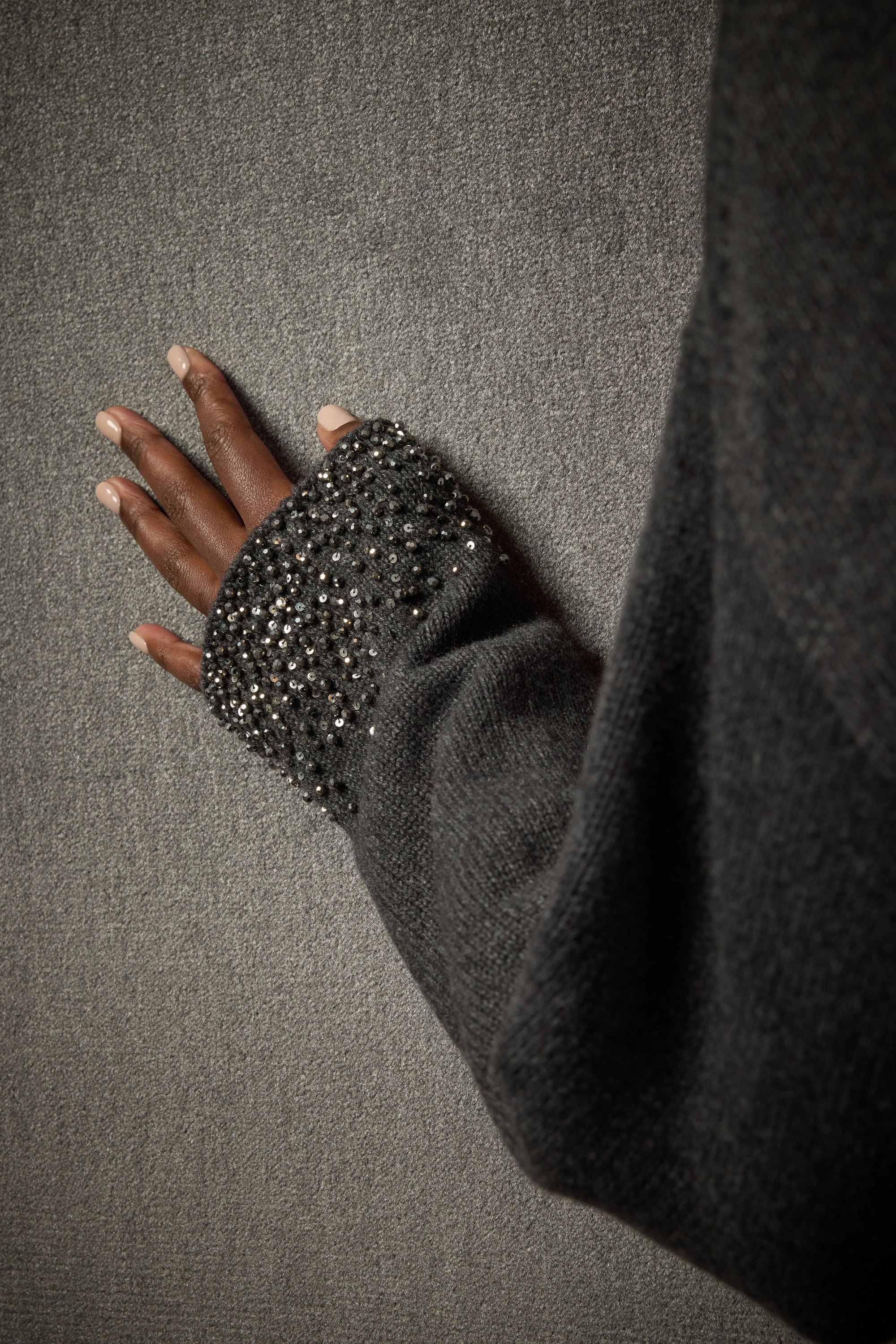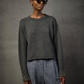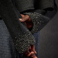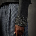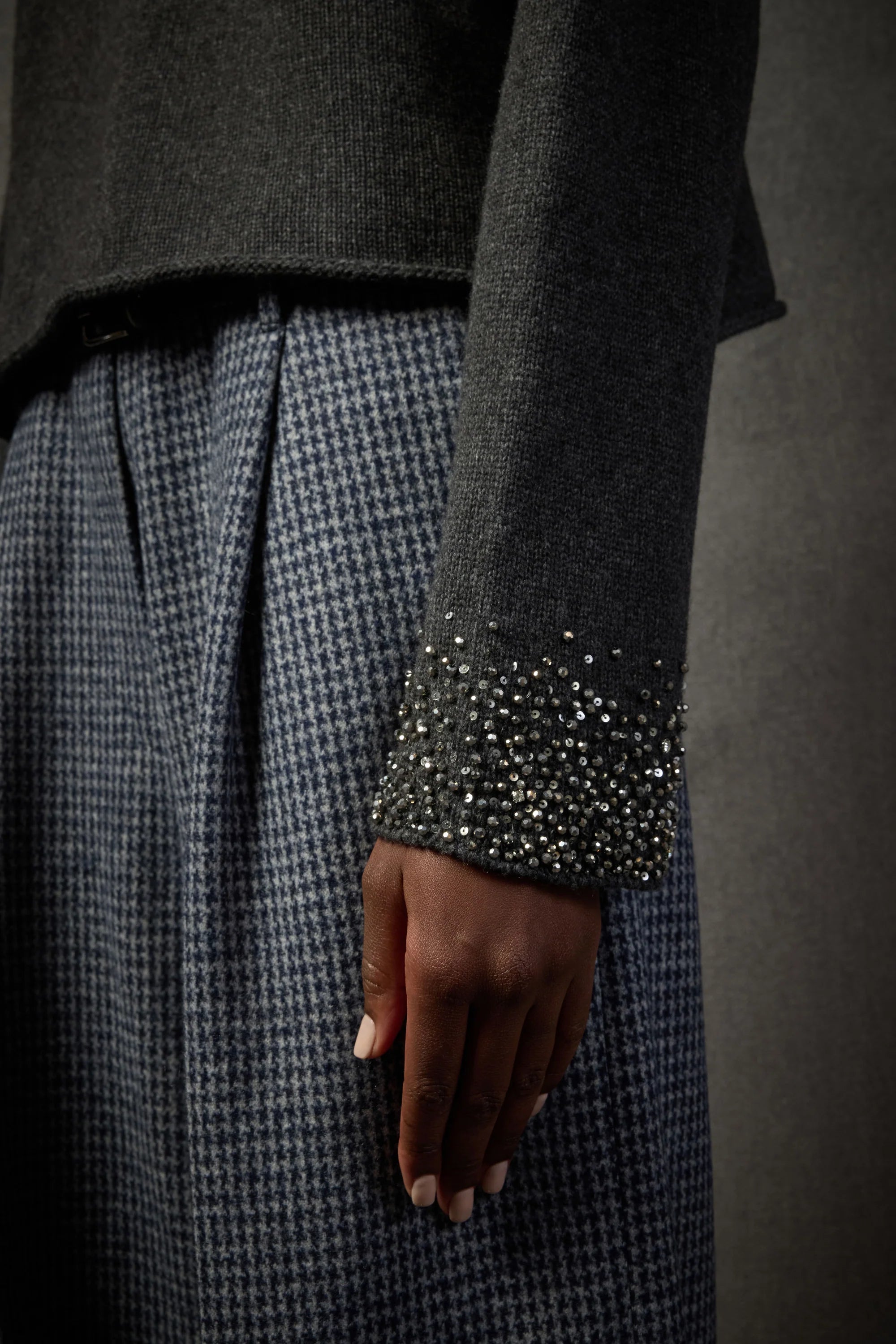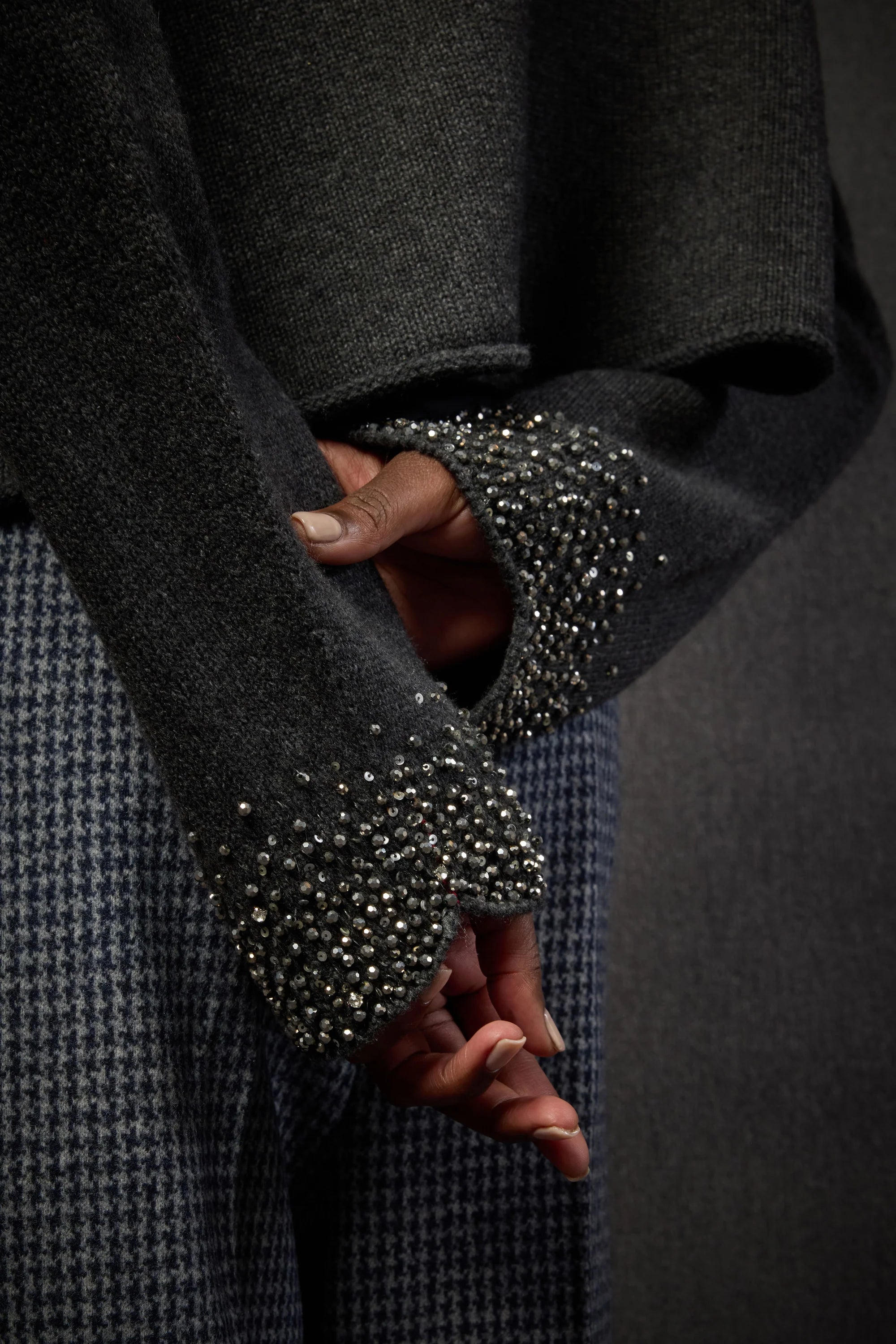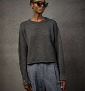 A timeless knit elevated with exquisite detail. This recycled cashmere sweater features a classic neckline, naturally rolled hem, and slightly dropped shoulders for effortless elegance. Long sleeves are finished with hand-applied rhinestone embroidery at the cuffs — adding just the right amount of shimmer to a refined silhouette.