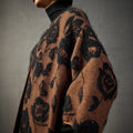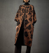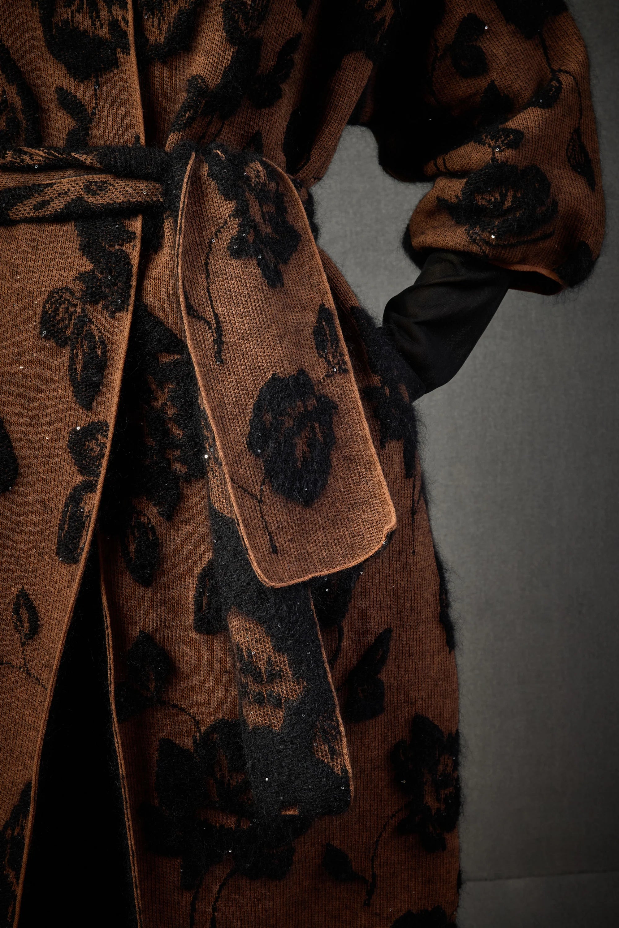 An artful statement in modern romance. This Italian-made coat, crafted from luxurious mohair, features a camel base embroidered with black roses and delicate iridescent sequins for a luminous finish. The boat neckline and long sleeves create an elegant drape, while satin bow closures at the back add a touch of femininity and surprise. A timeless yet bold silhouette that elevates every occasion.