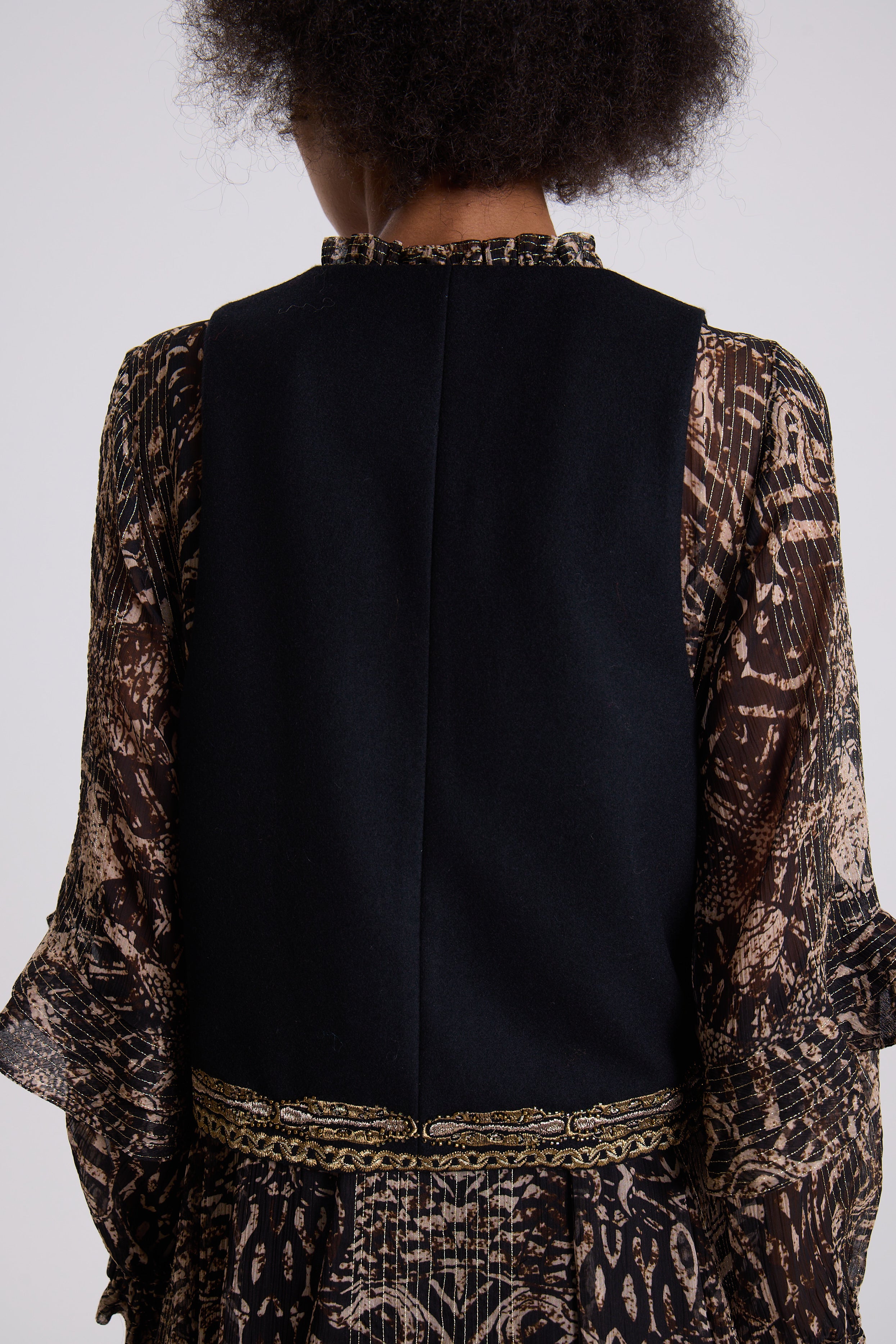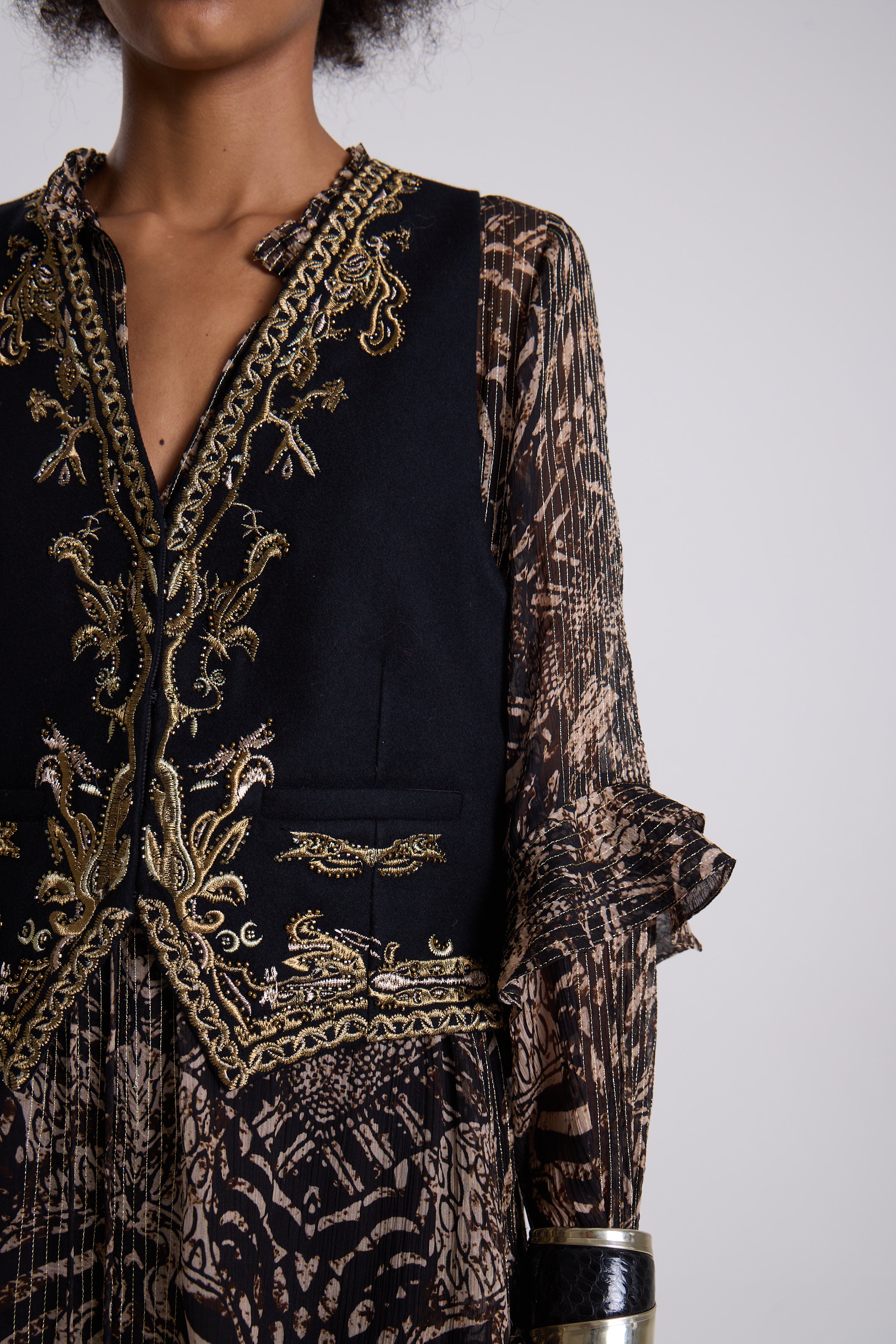 Richly detailed and timelessly elegant, this cotton-velvet vest features intricate gold embroidery that evokes artisanal craftsmanship and old-world charm. Layer it over a printed blouse or silk dress to add structure and a hint of bohemian refinement.