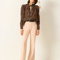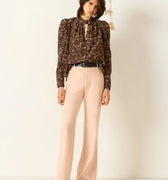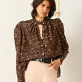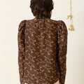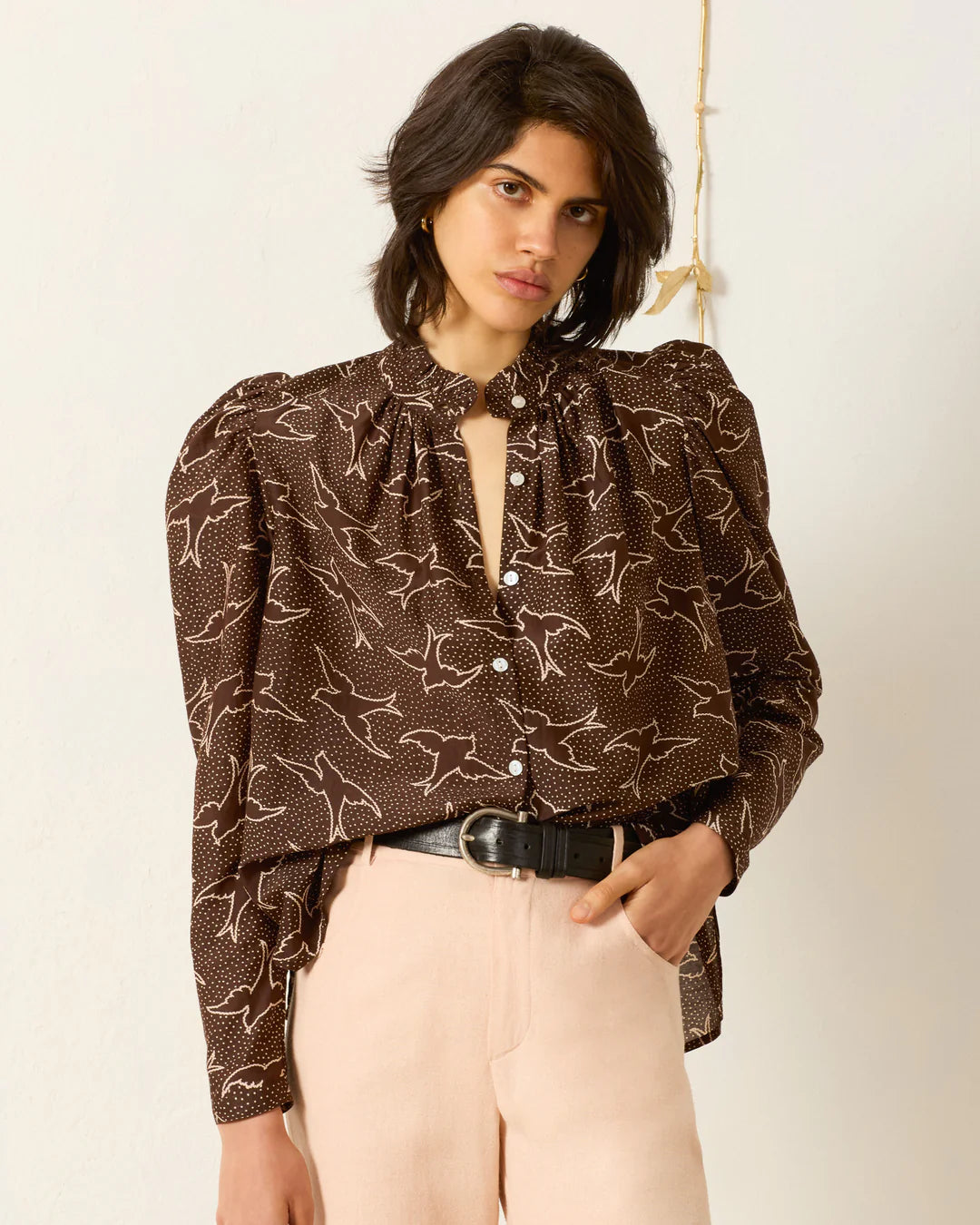 Individually cut by hand, this cotton-silk blend shirt has tapered puff sleeves and a feminine ruff collar.  The hand finished blouse features a swooping swallow motif.
