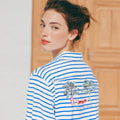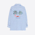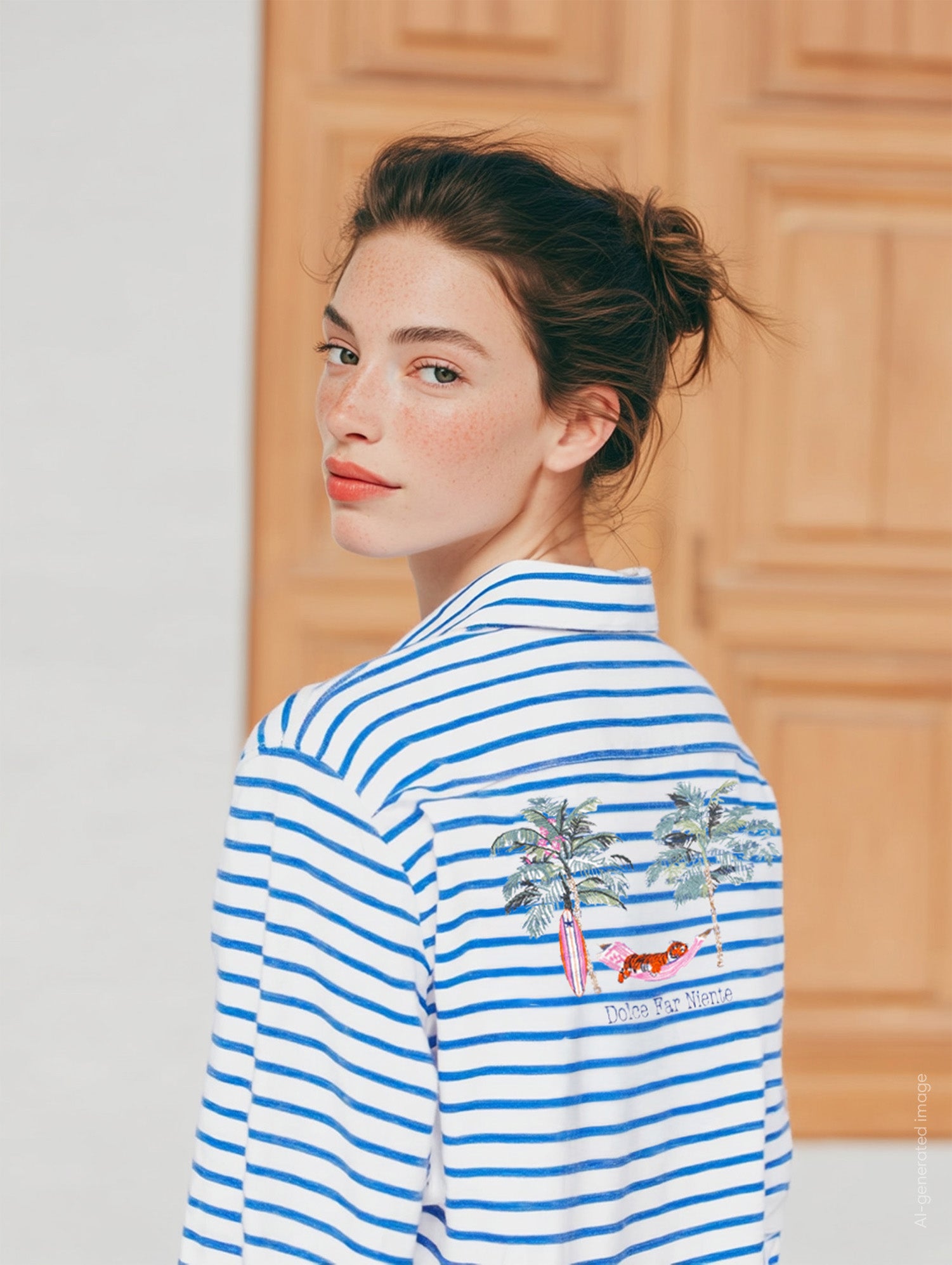A classic striped button-down with a relaxed silhouette, finished with a whimsical embroidered back detail for a hint of surprise. Easy, polished, and full of personality, it’s a timeless staple with a joyful twist.