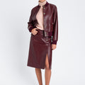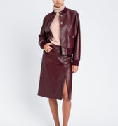 Cut in rich bordeaux with a sleek front slit, this skirt is accented by antique-gold buttons for a refined edge. Designed to pair with the matching jacket yet striking on its own, it embodies polished femininity with modern Italian tailoring. A limited Saujette selection for those who value rare finds.