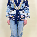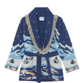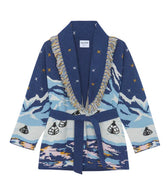 A collector’s piece. This hand-finished jacquard knit captures a dreamy alpine scene—gondolas, golden stars, and snowy peaks—wrapped in bold color and finished with a dramatic fringe collar. A cozy statement in true Saujette spirit: distinctive, artful, and luxuriously made.