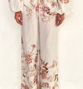 High-waisted pants with a soft, fluid drape and a romantic floral print. Designed with an easy, relaxed leg and a subtle waist tie, they move beautifully—effortless, feminine, and endlessly wearable.