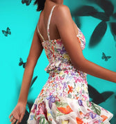 The Mara Skirt features a high-rise, smocked silhouette that hugs comfortably before flaring into a lace-trimmed, ruffled hem. Covered in the same whimsical butterfly print, it brings movement and charm to every step.