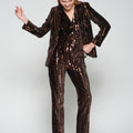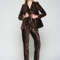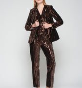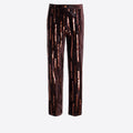Cut from deep brown velvet and adorned with bronze sequins, these straight-leg trousers bring radiance to every step. Comfortable yet refined, they elongate the silhouette and pair perfectly with the matching blazer—or shine solo with a sleek knit.