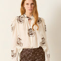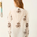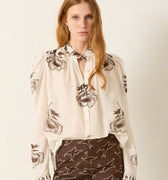Individually cut by hand, our cotton-silk blend shirt has tapered puff sleeves and a feminine ruffled collar. The monochrome blouse is hand-block-printed with a detailed poppy motif. This textile was block-printed by hand. Subtle printing and dye variations are part of the unique beauty of the garment and a signature of the artisan's hand.