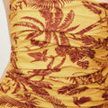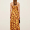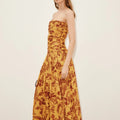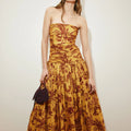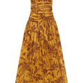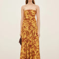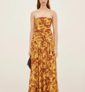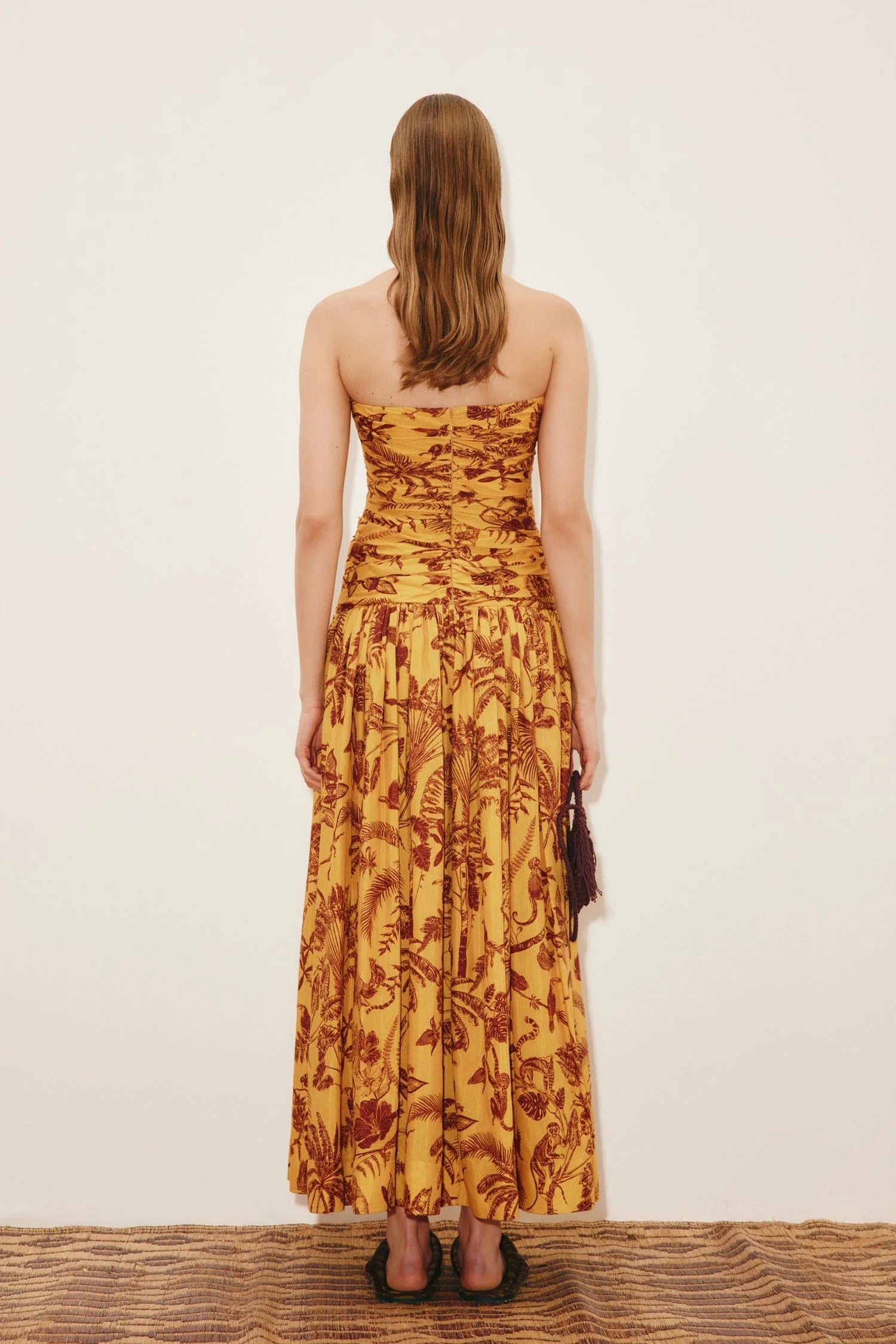 A striking strapless silhouette in airy ramie, this ruched gown features a softly structured bodice and a flowing gathered skirt that moves beautifully with every step. The warm golden hue is brought to life with Alemais’ signature tropical print, creating a piece that feels both bold and effortlessly elegant.