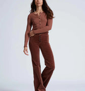 Introducing the Brighton Wide Leg jeans in sleek velvet. With a high rise and slim fit, these jeans feature a unique exposed button detail and light weight stretch fabric for ultimate comfort. Add a touch of luxury and style to your wardrobe with these one-of-a-kind jeans.
