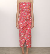 A striking strapless silhouette crafted in stretch cotton with a vibrant floral print. The Cleopatre Dress features soft ruching through the bodice and waist, creating a flattering, sculpted shape. A midi-length skirt with a subtle front slit adds movement and elegance.