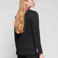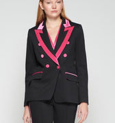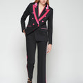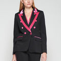 A sharp black blazer transformed with bold fuchsia velvet lapels, piping, and covered buttons. Double-breasted tailoring gives it structure, while the contrast detailing adds modern glamour—found at Saujette for women who love power dressing with a chic twist.